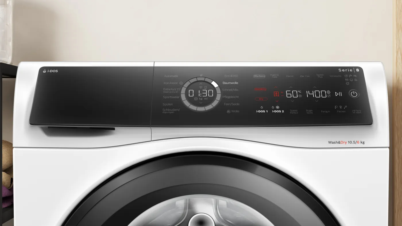 Bosch Serie 8 WNC254A40. Ladetyp: Frontlader, Geräteplatzierung: Freistehend, Produktfarbe: Weiß. Nennkapazität (Waschen & Trocknen): 6 kg, Maximale Schleuderdrehzahl: 1400 RPM, Schleuder-Klasse: B. Kabellänge: 2,01 m, Höhenverstellbare Füße: 1,2 cm. Energieeffizienzklasse (Waschen): A, Energieeffizienzklasse (Waschen & Trocknen): D, Wasserverbrauch pro Zyklus (Waschen): 50 l. Bosch-Technologien (Kleiderpflege): AquaStop, Easy-care, EcoSilence Drive™, Home Connect, Sportsachen, WaveDrum™, i-DOS Waschen und Trocknen in einem Durchgang.nKein Platz für einen Wäschetrockner? Kein Problem! Der Bosch Waschtrockner mit Auto Dry trocknet genauso effizient wie er wäscht. Die Auto Dry Funktion erkennt automatisch, wann die Wäsche trocken ist. Sensoren überwachen Temperatur und Feuchtigkeit. So wird die Wäsche auch vor Überhitzung geschützt. Die Wasch- und Trockenprogramme sind auf jede Textilart abgestimmt und sorgen für eine schonende und schrankfertige Wäschepflege. Bis zu 6 kg Wäsche in einem Durchgang waschen und trocknen oder bis zu 10,5 kg Wäsche nur waschen.nnSo einfach sparst du Wasser und Waschmittel.nDas automatische Dosiersystem i-DOS sorgt für maximale Effizienz beim Waschen. Einfach den Waschmittelbehälter mit Waschmittel oder Weichspüler befüllen und die i-DOS-Sensoren dosieren bei jedem Waschgang genau die Menge Wasser und Waschmittel, die du benötigst. So verschwendest du kein Waschmittel und vermeidest unnötige Spülgänge.nnErkennt automatisch den optimalen Trocknungsgrad.nFülle deinen Trockner oder Waschtrockner einfach mit bis zu zehn Kilogramm Wäsche. Auto Dry liefert dir deine Wäsche bügelfeucht, schranktrocken oder extratrocken – ganz wie du es wünschst. Intelligente Sensoren messen kontinuierlich die Temperatur und Feuchtigkeit, um deine Wäsche vor Überhitzen und Austrocknen zu schützen. Eine Sorge weniger.nnEntfernt automatisch die häufigsten Fleckentypen.nKein Fleck ist wie der andere. Die Auswahl des richtigen Waschprogramms für jeden Fleck kann sich aber ziemlich unübersichtlich gestalten und dann zu unbefriedigenden Waschergebnissen führen. Bosch Waschmaschinen mit Fleckenautomatik helfen dir, jeden Fleck zuverlässig und sanft zu entfernen. Die Fleckenautomatik entfernt mühelos bis zu 16 der hartnäckigsten Flecken – von Schokolade über Gras bis hin zu Rotwein. Die Waschmaschine passt die Temperatur, Trommelbewegung und Einweichzeit automatisch an die jeweiligen Flecken an, bevor das von dir gewählte Waschprogramm startet. So hilft dir die Fleckenautomatik, unabhängig von der Art der Flecken, auf einfache Weise zu perfekten Ergebnissen zu kommen. Vollkommen automatisch.nnSmarte Hausgeräte machen das Leben leichter.nDie Zukunft hat längst begonnen. Home Connect macht deine Hausgeräte mit wegweisender Technologie zu intelligenten Helfern, die du mit deinem Smartphone oder Tablet steuern kannst.nnDeine Bügelhilfe.nNur ein Tastendruck und der Stapel mit der Bügelwäsche schrumpft. Das Programm Iron Assist erzeugt in der Trocknertrommel natürlichen Wasserdampf, der die vorgewärmte Wäsche durchdringt und sie sichtbar glättet. Du kannst mit Iron Assist auch störende Gerüche aus Textilien entfernen oder nur kurz getragene Teile auffrischen. Perfekt geeignet für Jacken, Oberhemden, Wollsachen und sogar Anzüge.nnHocheffizientes Waschen – Energieklasse AnBeim Waschen auf Energie- und Ressourceneinsparung zu achten, kann sehr mühsam sein. Jetzt nicht mehr. Mit dem innovativen Hybrid FlexAir System wird der Bosch Premium Waschtrockner noch effizienter. Das System optimiert den Waschprozess automatisch und hilft, die Energieklasse A beim Waschen zu erreichen.nnDieser Antrieb ist garantiert leise und besonders langlebig.nLasse dich von deinem Waschtrockner nicht beim Abendessen stören. Der EcoSilence Drive™ von Bosch ist so leise, dass du dich schon mal fragen wirst, ob die Maschine überhaupt läuft. Der bürstenlose, energieeffiziente Motor ist besonders leise im Betrieb und extrem langlebig und er verfügt über eine 10-Jahres-Teilegarantie.nnEinfach und bequem waschen – mit dem Auto-Programm.nKeine Lust mehr auf komplizierte Waschanleitungen? Auto Programm, das intelligente System unseres Waschtrockners, kümmert sich um alles – von der Wahl des richtigen Wasch- und Trockenprogramms bis zur Einstellung von Wassertemperatur und Schleuderdrehzahl. Zurücklehnen, entspannen und der Waschtrockner erledigt den Rest.nnDas beste Wasch- und Trocknungsprogramm für deine Sportbekleidung.nIdeal für effektives und effizientes Waschen und Trocknen von Sportbekleidung, wie zum Beispiel Mikrofaser, Fleece oder Synthetik. Diese Textilien verschmutzen üblicherweise nur leicht, weshalb ein kurzer Wasch- und Spülgang bei niedriger Temperatur ausreicht. Sportbekleidung besteht oft aus Synthetikfasern, die leicht knittern. Daher ist das Sportswear-Spezialprogramm mit seinen niedrigen Waschtemperaturen besonders schonend für diese empfindlichen Textilien. Die geringe Schleuderdrehzahl und das kurze Auflockern am Ende reduziert außerdem die Knitterbildung.