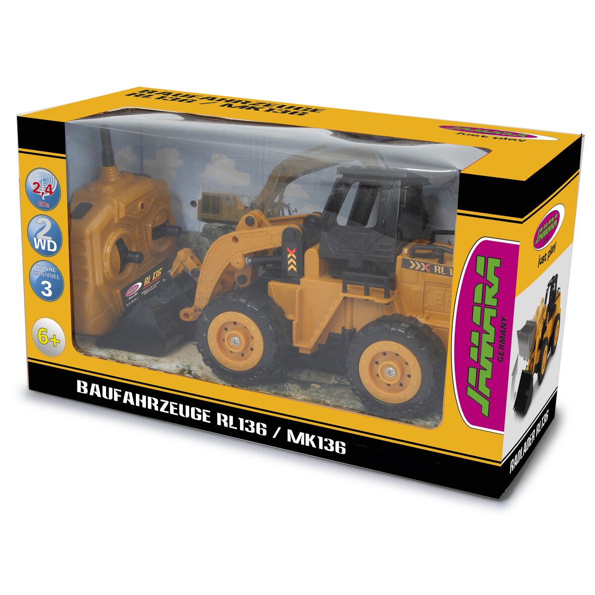 Jetzt kommt Spaß ins Spielzimmer. Die 1:36 Baufahrzeuge von Jamara. Der kleine Radlader und der fleißige Muldenkipper. Gefertigt aus stabilem Kunststoff und ausgestattet mit einer robusten Karosserie, sind beide Fahrzeuge mit der handlichen Fernsteuerung leicht zu bedienen. Schaufel heben, senken und abkippen und Kippmulde hoch und runter sind die Features die jeden kleinen Spielfreund begeistern werden. Einzeln erhältlich bei JAMARA.