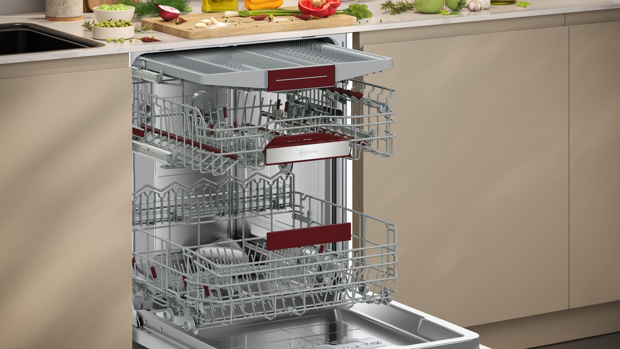 Neff S257ZCX01E. Geräteplatzierung: Voll integriert, Produktgröße: Standardgröße (60 cm), Bedienfeld Farbe: Edelstahl. Anzahl Maßgedecke: 14 Maßgedecke, Lärmemissionsklasse: B, Geräuschpegel: 40 dB. Höhenverstellbare Füße: 6 cm, Bedienung durch Apps unterstützt: Home Connect. Energieeffizienzklasse: B, Wasserverbrauch pro Zyklus: 9 l, Energieverbrauch pro 100 Zyklen: 65 kWh. Breite: 598 mm, Tiefe: 550 mm, Höhe: 865 mm Flex 2 mit with Flex Besteckschublade und Rack MaticnDie Ober- und Unterkörbe des Flex 2 Korbsystems haben je sechs umklappbare Tellerhaltereihen. Gläser und Tassen sind im Oberkorb durch weiche Silikonbeschichtungen besonders sicher. Beladen geht durch die 3-fach RackMatic, mit der selbst der volle Oberkorb auf drei verschiedene Höhen eingestellt werden kann, ganz flexibel. Im Unterkorb sorgt ein höherer Rand für sicheren Stand von höherem Geschirr. Die Besteckschublade bietet zusätzlichen Platz für Besteck.nnTimeLightnManche Dinge im Leben müssen auf einen Blick erkennbar sein. Dazu gehört auch der aktuelle Programmfortschritt und die Restlaufzeit des Geschirrspülers. Unser intelligenter Helfer TimeLight projiziert diese Informationen gut lesbar auf jede Art von Küchenboden. Auch eine vollintegrierte Geschirrspülmaschine ohne sichtbare Bedienblende stellt Sie damit nicht mehr vor Rätsel: eine gestochen scharf projizierte Zeitanzeige am Fußboden zeigt, wie lange Sie sich noch entspannt zurücklehnen können.nnBessere Trocknung, weniger Energieverbrauch.nDer Zeolith-Behälter® unter dem Spülerinnenraum enthält natürliche Mineralien. Während der Trocknungsphase nehmen die Zeolith-Kügelchen Feuchtigkeit auf und geben diese anschließend in Form von heißer Luft ab. Unterschiedlichstes Geschirr, einschließlich schwer zu trocknenden Kunststoffen, wird somit effizient (ressourcenschonend) und effektiv (fleckenfrei) getrocknet. Die Regenerierungsphase während des darauffolgenden Spülgangs garantiert eine lang anhaltende und wartungsfreie Nutzung, sodass stets ein hervorragendes Trocknungsergebnis erzielt wird.nnHartnäckige Verschmutzungen? Schwamm drüber.nManche Geschirrspüler sind einfach überfordert mit Eingebranntem und Eingebackenem. Nicht so das Chef 70°C-Programm: Die besonders heiße Temperatur und der kraftvolle Sprühstrahl entfernen selbst hartnäckigste Rückstände von Töpfen, Pfannen, Auflaufformen und Geschirr. Damit Sie sich ganz kreativ anderweitig austoben können.nnSpeichern Sie Ihren individuellen Favoriten.nWählen Sie ein Programm, eine Option oder eine Kombination an Ihrem Geschirrspüler und speichern Sie diesen als Favorit. Die Bedienung ist flexibel – entweder über Ihre Home Connect-App oder direkt am Gerät. Starten Sie Ihre Favoriten mit einem Fingerdruck. Und genießen Sie dann ein bisschen mehr Extrazeit für sich selbst.nnHome ConnectnHome Connect hebt die Grenzen Ihrer Küche und Ihrer Kreativität auf. Bedienen Sie Ihren Backofen, Kühlschrank, Geschirrspüler und andere Hausgeräte ganz einfach über WLAN. Tippen Sie in der App, steuern Sie Ihren Backofen per Sprachbefehl und lassen Sie Ihre Küchengeräte automatisch miteinander kommunizieren. Ganz schön smart! Home Connect ist eine stets wachsende Plattform, mit der Sie die Zukunft in Ihre Küche holen.nnMehr Flexibilität mit mehr Download-Programmen.nNutzen Sie die Programme Ihres Geschirrspülers optimal, indem Sie das für die jeweilige Beladung am besten geeignete Programm auswählen. Laden Sie zusätzliche Spülprogramme über Ihre Home-Connect-App herunter und wählen Sie das ideale Programm für Ihre wechselnden Anforderungen.nnFerndiagnose für schnelle und flexible LösungennManche Probleme lassen sich mit einem einfachen Tastendruck lösen. Deshalb haben wir Geschirrspüler mit Ferndiagnose entwickelt.Unsere professionelle Ferndiagnose ist immer an Ihrer Seite: Mit Ihrer Zustimmung greift unser NEFF-Kundendienst aus der Ferne auf Ihr Gerät zu, um das Problem zu identifizieren. Wenn das Problem mit einem Knopfdruck gelöst werden kann, erledigen wir das für Sie. Und wenn es nicht ganz so einfach geht, schicken wir einen Techniker vorbei.nnHilfe bei der ProgrammauswahlnDer Programme Assistent reagiert auf Ihre Bedürfnisse und Prioritäten und berät Sie, welches Geschirrspülerprogramm für welche Ladung geeignet ist. Geben Sie einfach folgende Informationen in die die Home-Connect-App ein: Art des Geschirrs, seinen Verschmutzungsgrad sowie einige persönliche Einstellungen wie Trockenheitsgrad, Geschwindigkeit, Geräuscharmut und Energieeffizienz. Der Programme Assistent gibt eine zuverlässige Empfehlung für die Programmauswahl ab. Sie müssen dann nur noch auf den Startknopf drücken!nnKeine Sorge mehr bezüglich Wasserschäden.nLehnen Sie sich zurück. Unser Aqua Stop-System schützt vor Wasserschäden. Bei Störungen wird über ein Sicherheitsventil der Zulauf automatisch gestoppt . Sie müssen lediglich dafür sorgen, dass alles korrekt installiert und angeschlossen ist. Die Aqua Stop-Garantie erhalten Sie zusätzlich zur Gerätegarantie. Und sie gilt für die gesamte Lebensdauer Ihres Geschirrspülers.