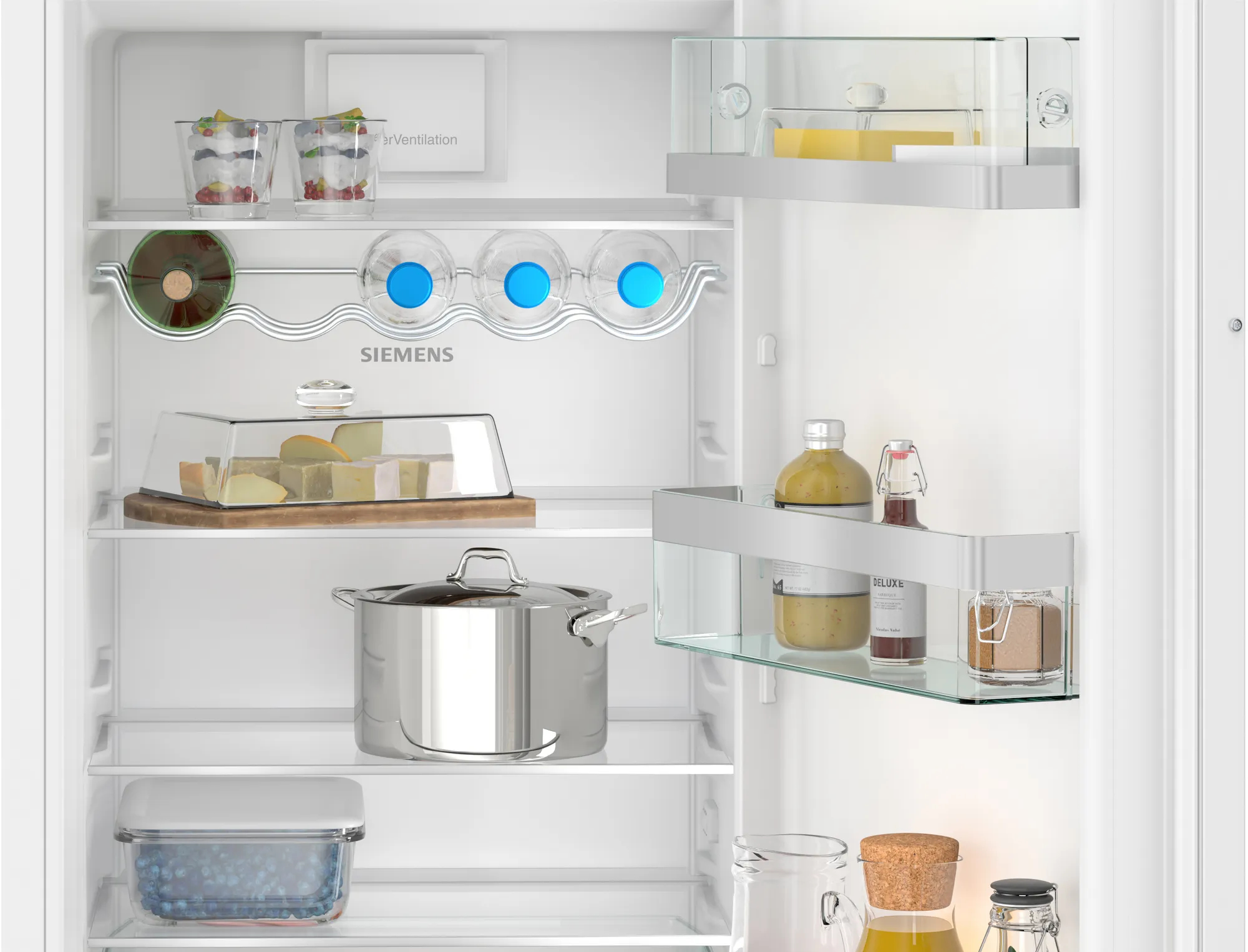 Siemens iQ500 KI82LADD0. Geräteplatzierung: Integriert, Produktfarbe: Weiß, Türscharnier: Rechts. Nutzinhalt Gesamteinheit: 280 l, Klimaklasse: SN-ST, Lärmemissionsklasse: B. Nutzinhalt Kühlschrank: 246 l, Lampentyp: Glühend. Gefrierfachposition: Oben, Nutzinhalt Gefrierfach: 34 l, Gefrierkapazität: 2,5 kg/24h. Kabellänge: 2,3 m Mehr Platz und mehr FrischenGenügend Platz für all Ihr Obst und Gemüse. Und ein separates Fach für Fisch und Fleisch mit eigenem Kaltluftsystem. So bleiben Ihre hochwertigen Lebensmittel länger frisch. Mehr Platz und ideale Lagerbedingungen in einem einzigen System.nnAuf einen Blick sehen, was im Kühlschrank ist.nDas eingebaute LED-Licht sorgt für eine gleichmäßige Ausleuchtung, sodass du direkt siehst, was du Gutes im Kühlschrank hast.Die Positionierung der LEDs im vorderen Bereich des Kühlschranks sorgt dafür, dass Lebensmittel nichts verdunkeln.Noch besser: Die LEDs sind langlebig und energieeffizient.nnKurzzeitige Temperaturabsenkung zum Abkühlen von LebensmittelnnMit superCooling kannst du die Temperatur deines Kühlschranks für eine bestimmte Zeit senken, um frische Lebensmittel schnell herunterzukühlen. Damit wird ein unerwünschter Temperaturanstieg der bereits gekühlten Lebensmittel verhindert.nnOptimale Flaschenaufbewahrung.nMit unserem bottleRack bekommst du ein spezielles Regal zur Aufbewahrung von Flaschen. Lagere große und kleine Flaschen sowie Dosen im Kühlschrank, ohne dass sie darin umherrollen oder klappern. In den praktischen, separaten Regalelementen sind deine Flaschen leicht greifbar und gleichzeitig sicher verstaut.nnImmer fest geschlossen – die softClosing-Tür.nMit einer softClosing-Tür ist Ihr Kühl- oder Gefrierschrank stets ordnungsgemäß und vollständig geschlossen. Außerdem ist eine Türdämpfung in allen Flachscharnieren integriert. So lassen sich selbst stark beladene Türen leicht und sicher schließen – ein Geräteleben langnnFür eine Individuelle Anordnung des Gefrierraums.nMit varioZone können Sie Schubladen und die Glasablagen zwischen den Schubladen nach Bedarf entfernen. Die flexible Anordnung Ihres Gefrierfachs macht es zu Ihrem individuellen Lagerraum für Gefriergut.nnBruchsichere und leicht zu reinigende Glasablagen.nAlle Glasablagen bestehen aus extrastarkem, reinigungsfreundlichem Sicherheitsglas. Fällt mal etwas um, wird die verschüttete Flüssigkeit eingedämmt und läuft nicht durch den gesamten Kühlraum.nnEine praktische Schublade für alles, was frisch ist und bleiben soll.nIn dieser stabilen und durchdachten Schublade bleiben Ihr Obst und Gemüse gut geschützt und frisch. Und immer in optimaler Reichweite.nnIndividuelle Temperaturregelung für mehr Flexibilität.nWäre es nicht schön zu Hause Energie zu sparen, während du im Urlaub bist? Jetzt kannst du den Kühl- und Gefrierbereich separat steuern und die Temperaturen jeweils nach deinen Anforderungen einstellen. Mit dieser Flexibilität kannst du die Temperatur erhöhen und dadurch Energie sparen.